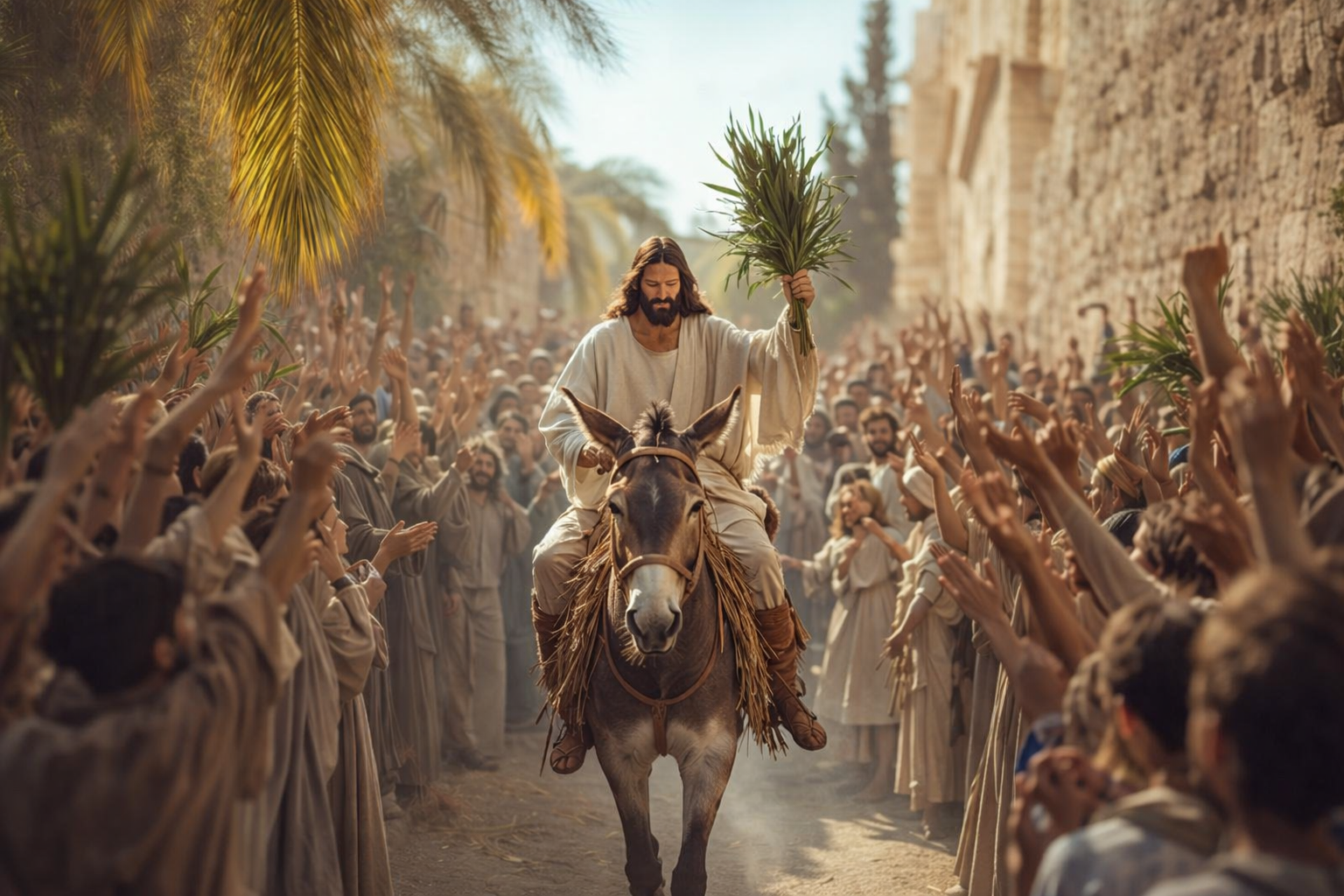 È la pace biblica, lo shalom (שָׁלוֹם), che non indica semplicemente assenza di guerra, ma pienezza di vita, armonia, compimento. Nel Nuovo Testamento questa realtà si esprime con il termine eirēnē (εἰρήνη), che Cristo dona ai suoi discepoli: «Vi lascio la pace, vi do la mia pace» (Gv 14,27). Come scrive anche Enzo Bianchi, «la pace di Cristo non è evasione dal conflitto, ma capacità di attraversarlo senza perdere l'amore»: è una pace che trasforma il cuore e genera comunione. Ecco allora il senso profondo di questo ingresso: non è solo l'arrivo di Gesù in una città, ma la rivelazione di un modo nuovo di essere Re, di un modo nuovo di salvare, di un modo nuovo di vivere la potenza di Dio. Un ingresso che è già annuncio della Pasqua, già anticipo della croce, già promessa della risurrezione.